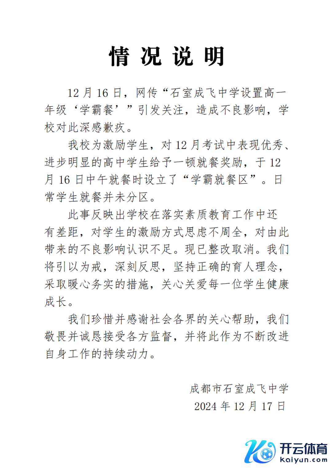 12月17日上昼开云体育,成齐市石室成飞中学发布情况讲明。全文如下:
