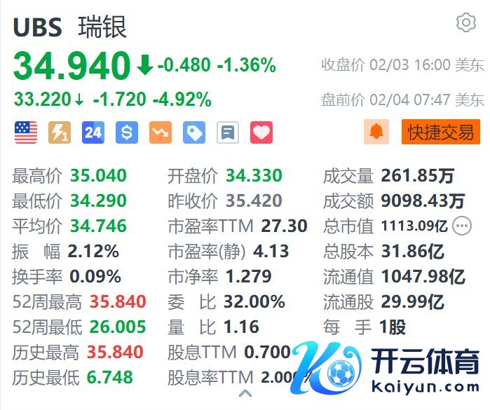 格隆汇2月4日|瑞银(UBS.US)盘前跌4.9%,报33.22好意思元。音问面上,瑞银第四季度营收为116.35亿好意思元,同比增长7%,分析师预期为115.1亿好意思元;净利润为7.7亿好意思元,而前年同时亏空2.79亿好意思元。期内民众资产处罚部门净增资产180亿好意思元,较前一季度的250亿好意思元有所放缓。此外,瑞银展望,以瑞士法郎计,第一季度民众资产处罚的净利息收入(NII)将环比下镌汰至中个位数百分比,个东说念主与企业银行的NII将着落约10%。(格隆汇)